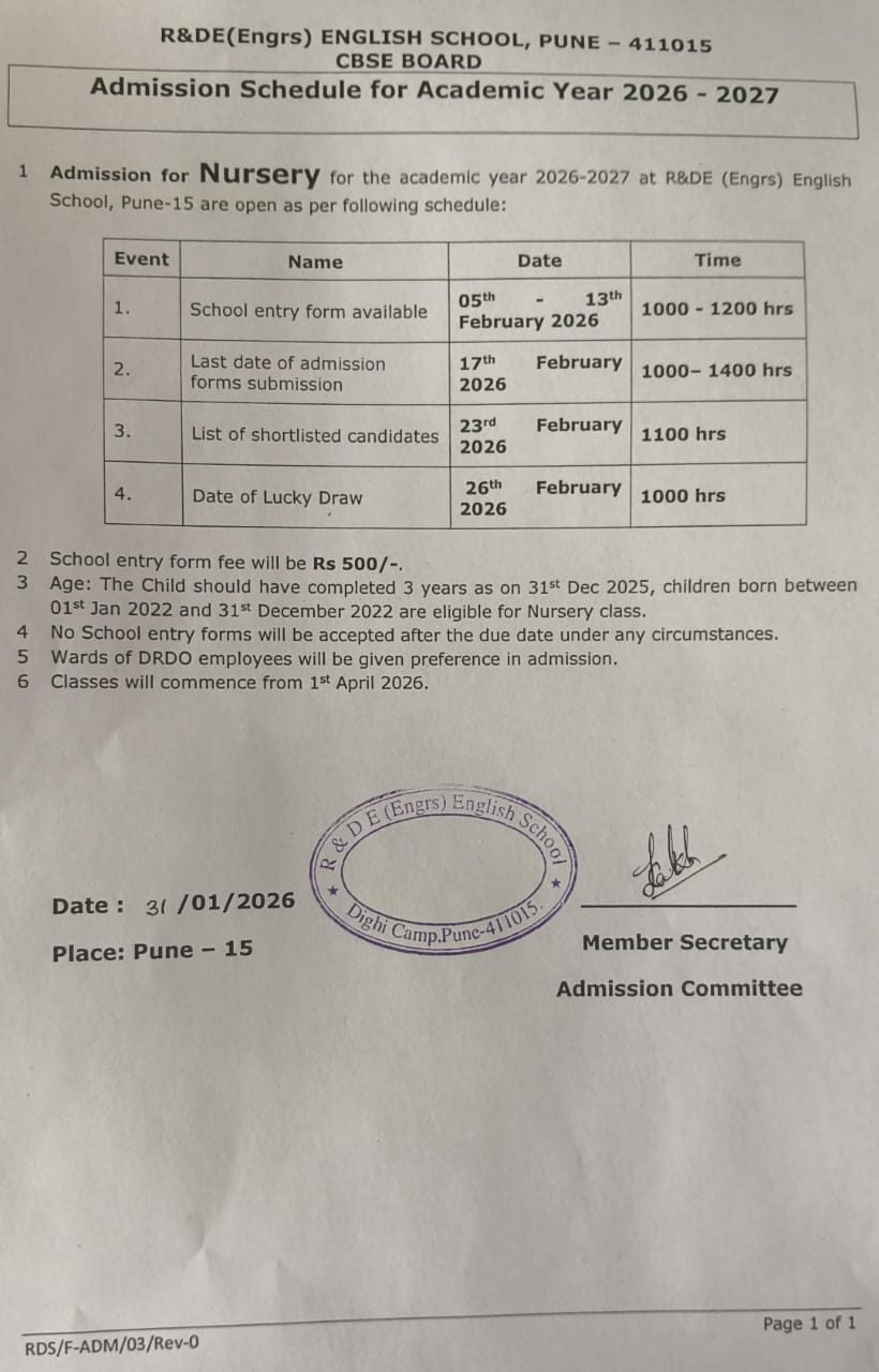 R & D E (E) English School, Pune is a welfare school run by the Research & Development Establishment (Engineers) Organization, working under DRDO which do research to produce advanced technological equipment’s useful for our Defence (Army, Navy and Air-force). Despite of busy schedule and lack of time, Director of R & D E (E) Organization and School Managing Committee members take keen interest in social responsibilities and look into the matter of smooth conduct of the school which is made for the wards of R & D E (E) employees and also for the needy children in this area.